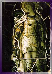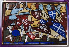 Stained glass window depicting a battle scene. Various techniques were used in the making of this panel including acid etching, painting, and sandblasting. |